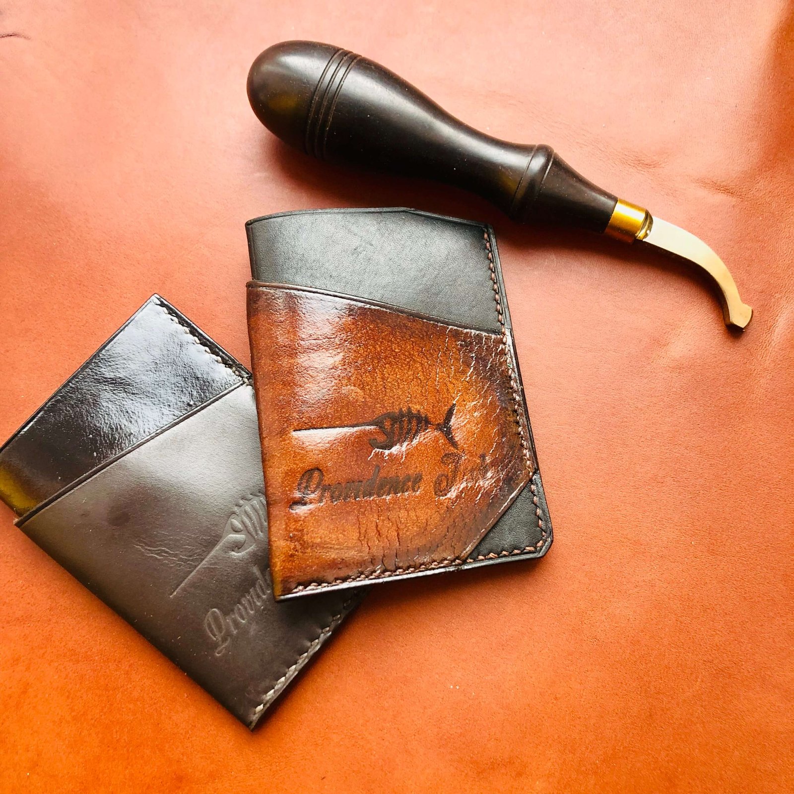 A minimalist handcrafted card holder made from vegetable-tanned leather in a warm black/borown tone. Designed by Providence Fish for those who appreciate simplicity, function, and timeless craftsmanship.