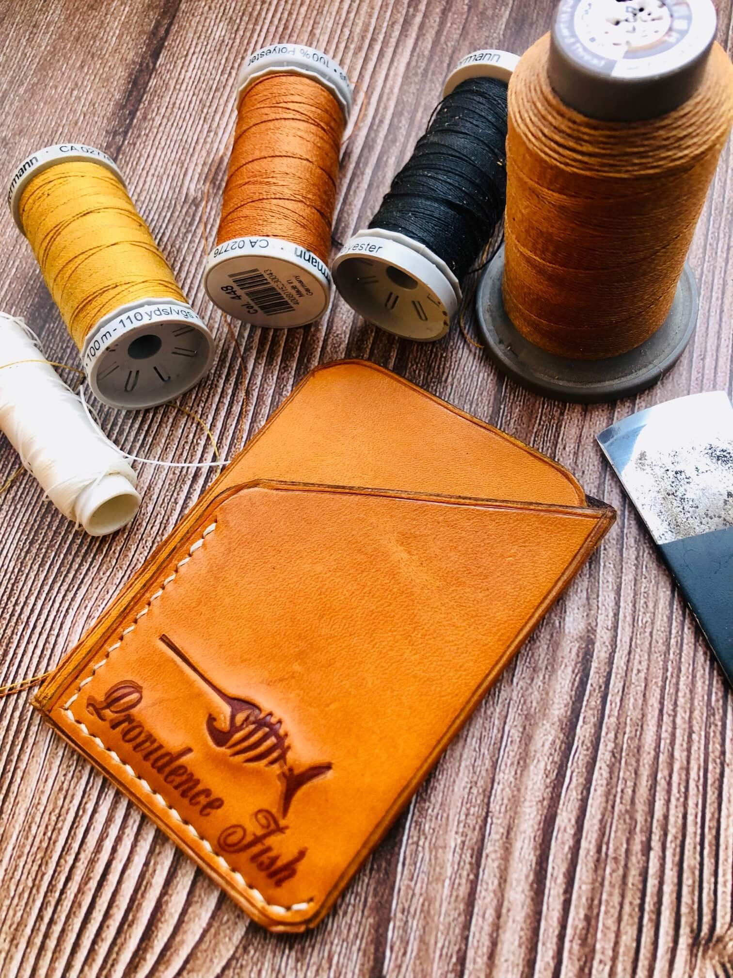 A minimalist handcrafted card holder made from vegetable-tanned leather in a warm camel tone. Designed by Providence Fish for those who appreciate simplicity, function, and timeless craftsmanship.