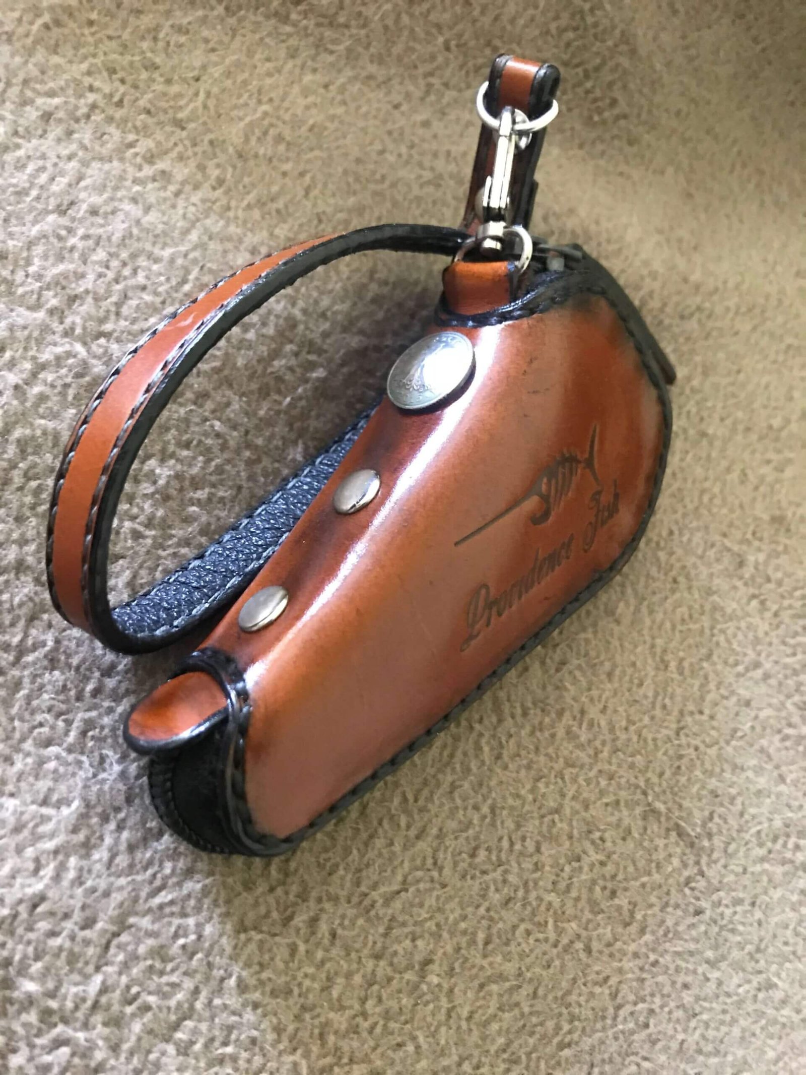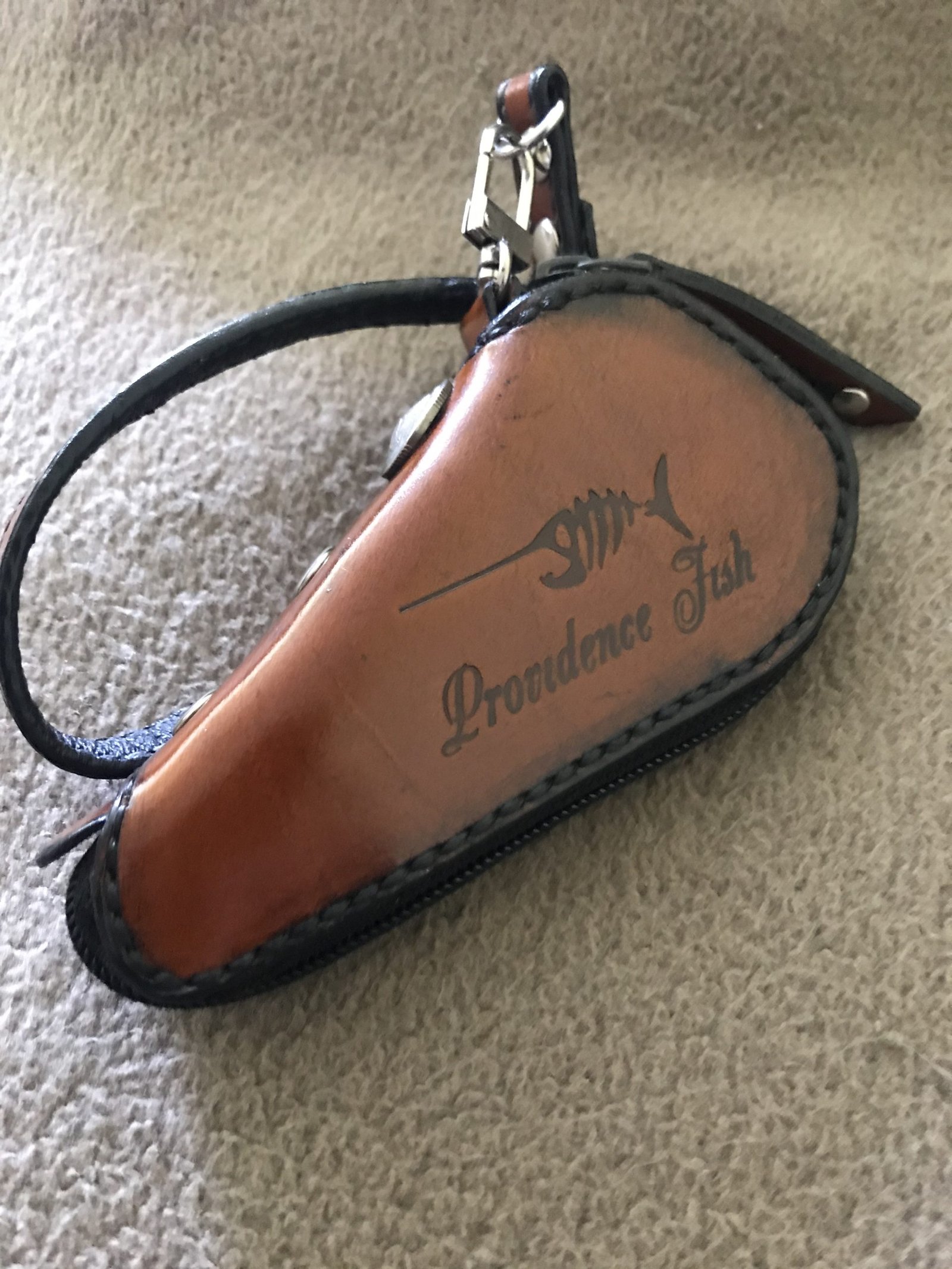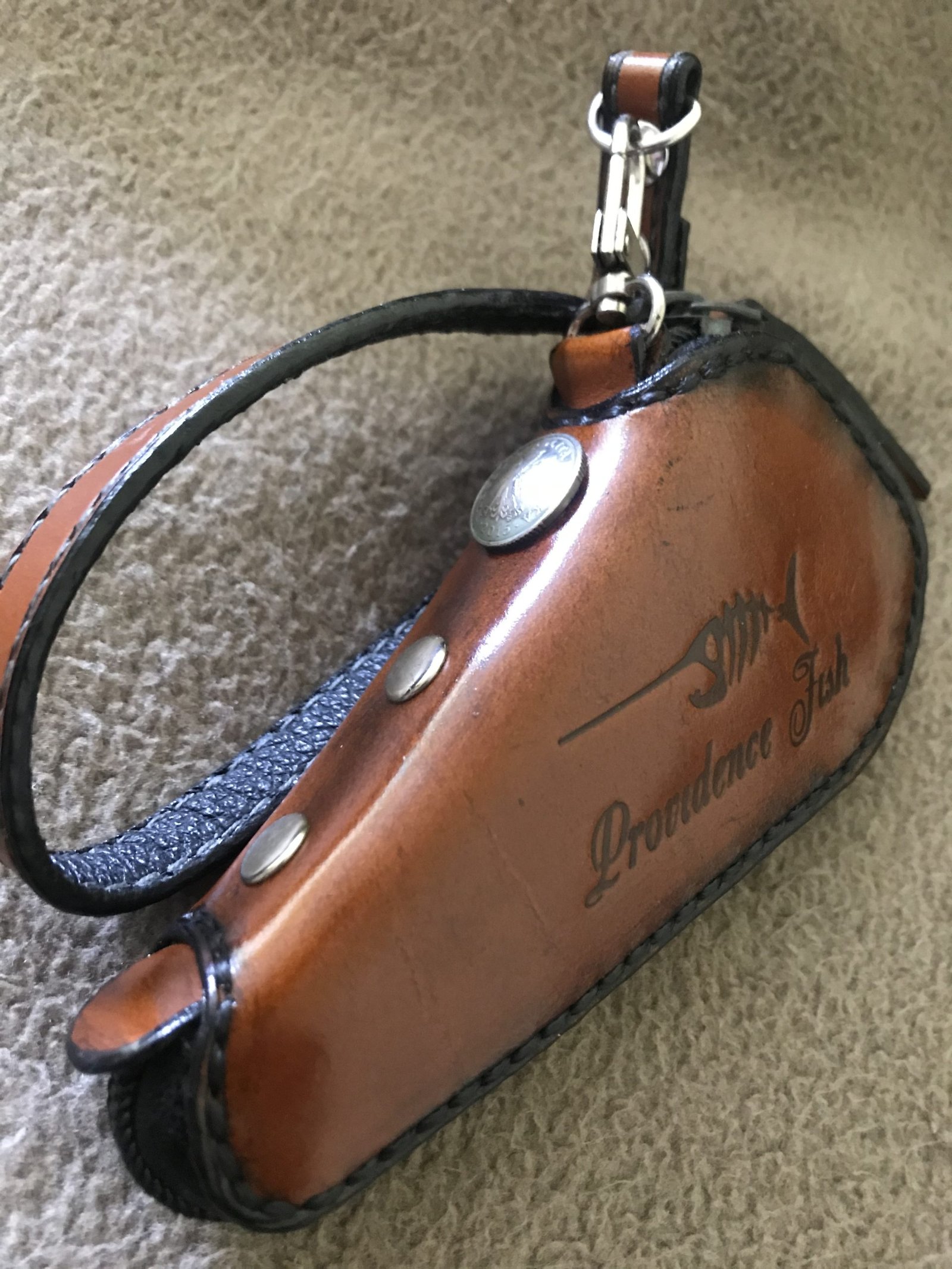 A distinctive handcrafted leather key case, designed with a bold silhouette and finished in a warm cognac-brown tone with a hand-applied patina. Featuring our signature “Providence Fish” engraving, this case stands out as both functional and artistic.