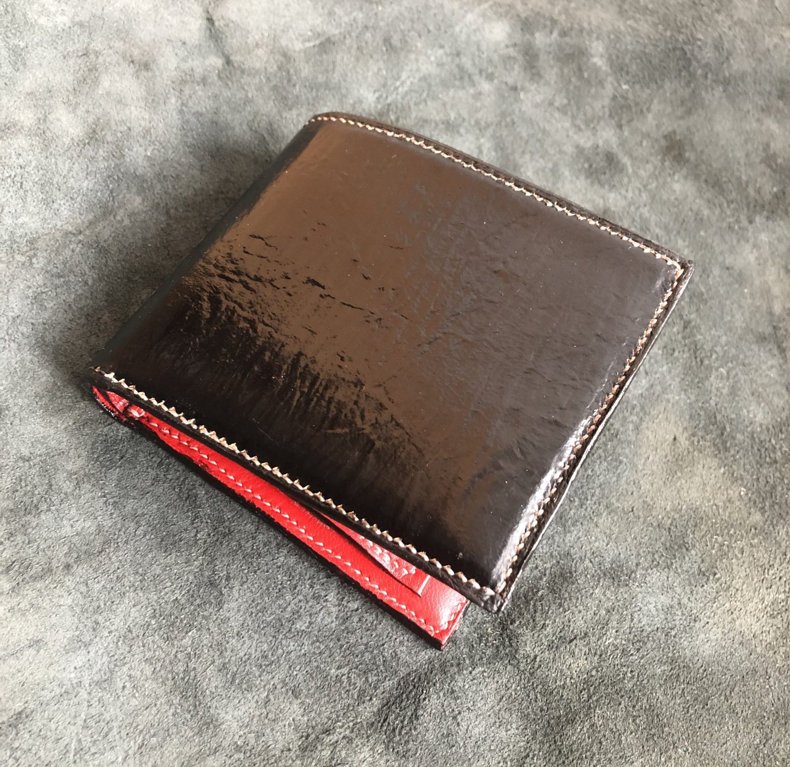 Handmade bifold wallet in textured black leather with red goat leather interior. Features 5 card slots, a bill compartment, and a spacious coin pocket.