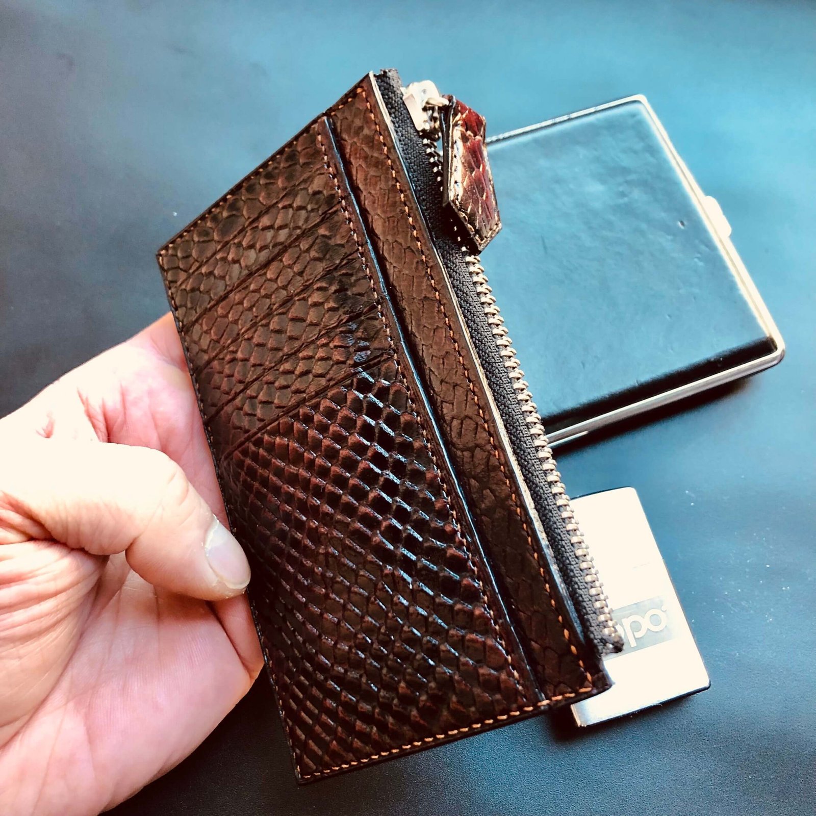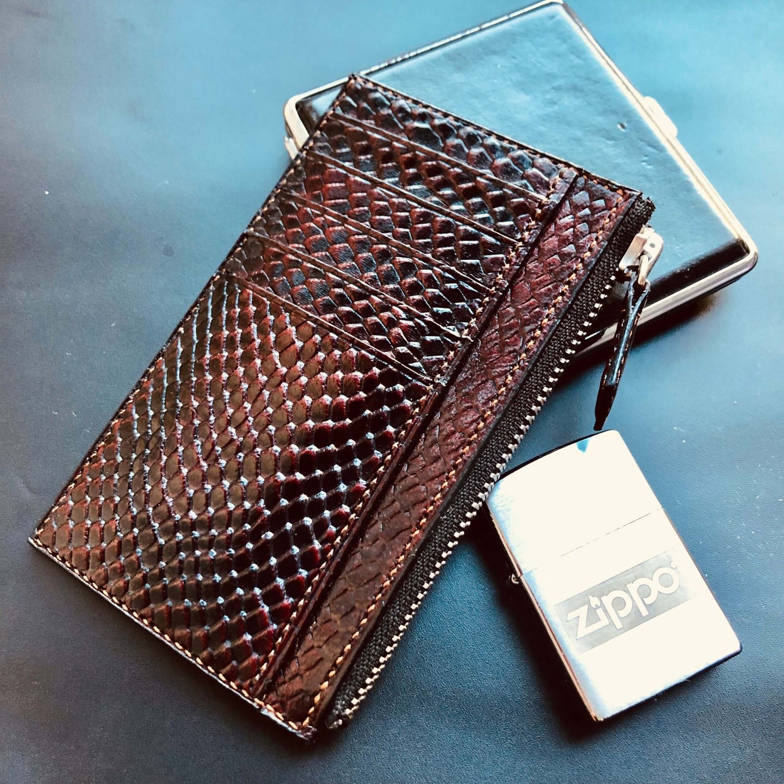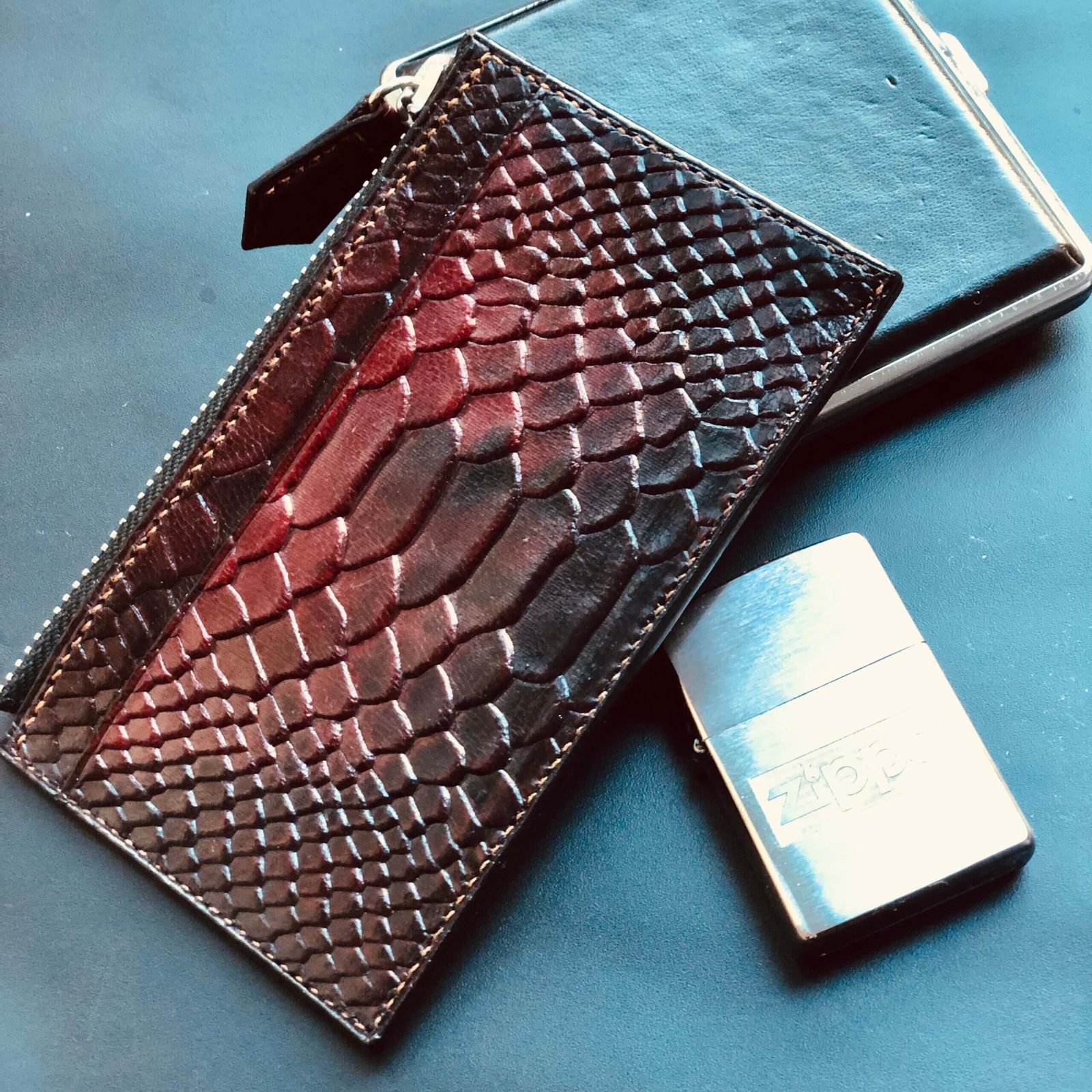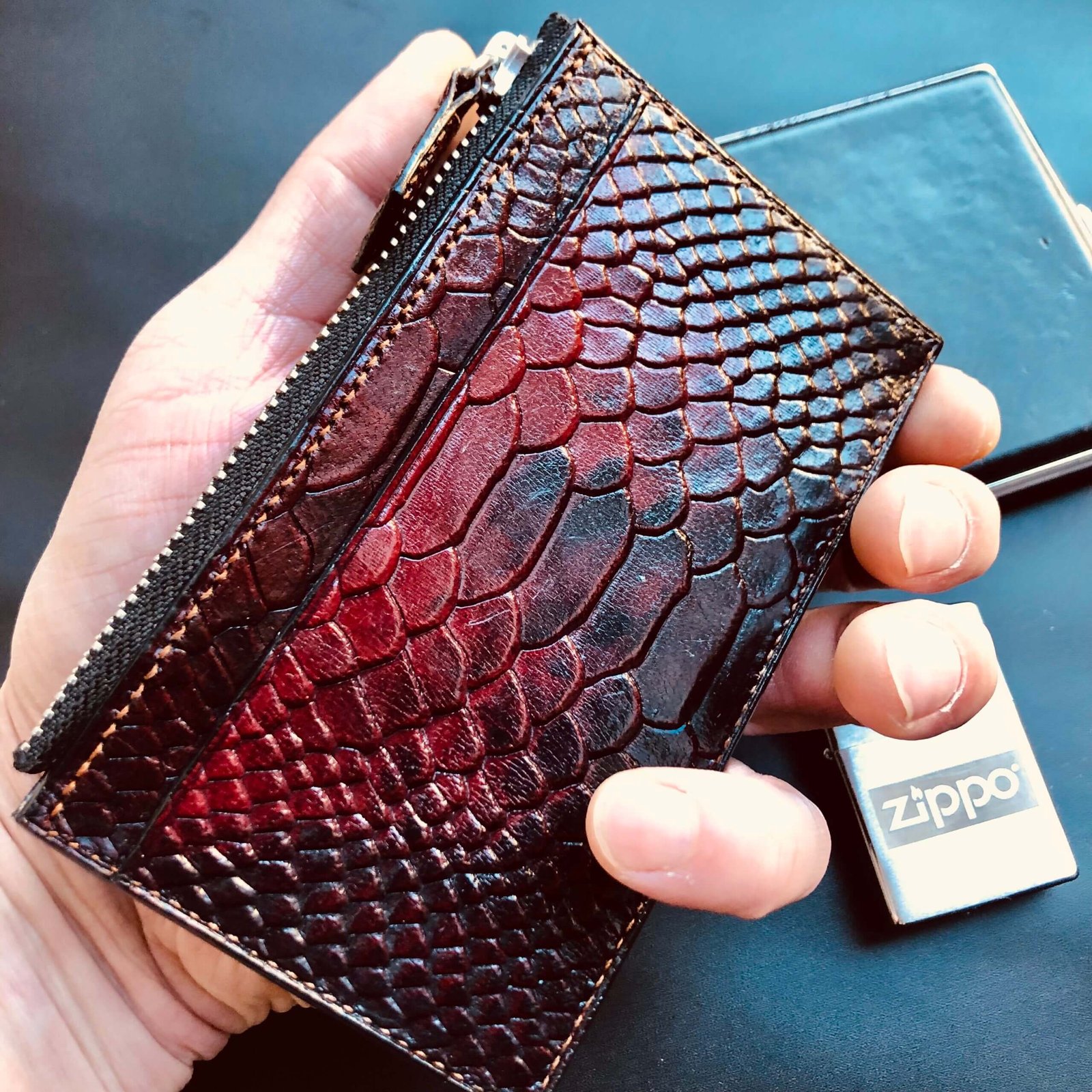 Red patina Zipped Cardwallet  with Italian lacquer finish, 4 card slots, 2 document compartments, and a zip pocket.